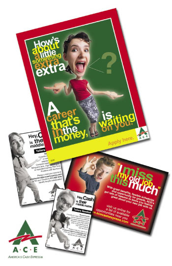 I designed a fun, whimsical campaign for Ace Cash Express to appeal to a younger audience. A variety of black and white and color print ads, direct mail pieces and a cinema slide (played before the previews at a movie) were created. The ads focused around the high wages and great benefits the company has. |
