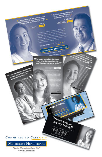 Methodist Healthcare System (MHS) is the largest health care employer in San Antonio and they needed to be differentiated from their competition. The “Committed to careers” campaign features full-sized billboards and non-traditional recruitment media, radio, television, outdoor, direct mail and the Internet. We conducted 30 personal interviews with individuals from different departments and career levels to create a testimonial campaign featuring real MHS employees. |